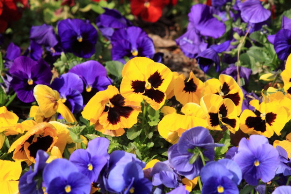 寄せ植えのコツとしては、同じ品種のもので、同じ色の花を使うことです。できれば1つのプランターに1色だけの方がきれいに見えます。パンジーやビオラと他の花を寄せ植えしたいのであれば、濃い色のパンジーやビオラにノースポール、もしくは背の高いグリーンなどが合うでしょう。